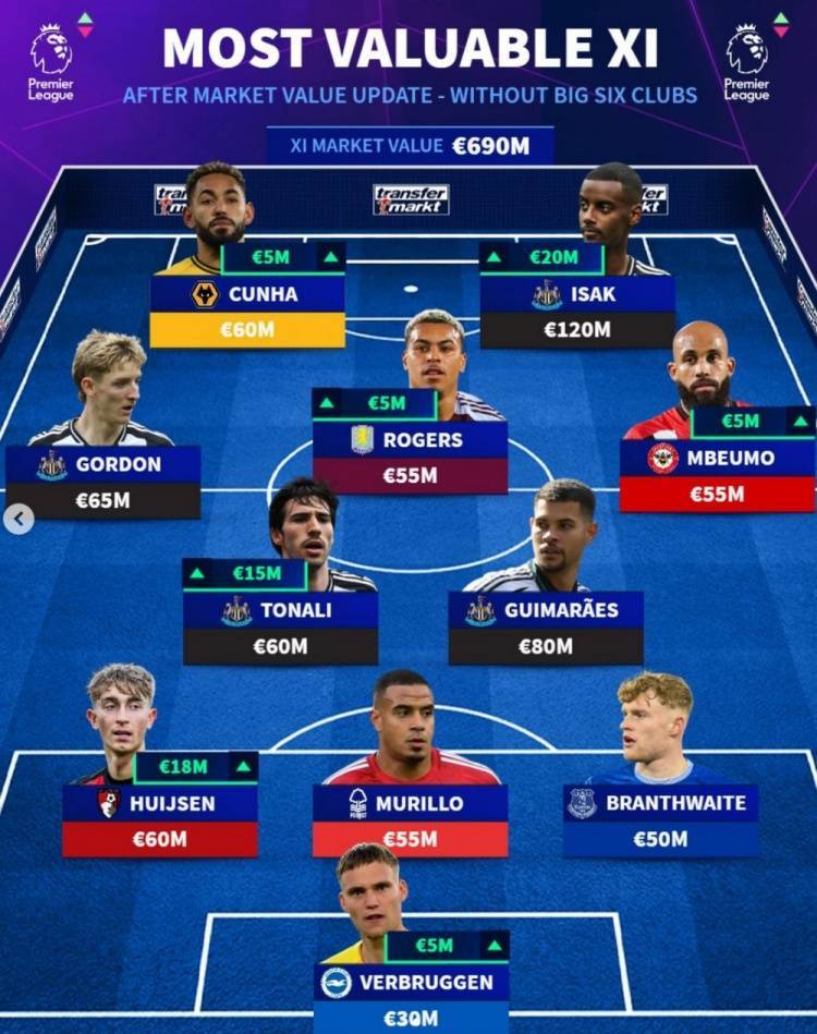 直播吧6月1日讯 德转此前更新了英超球员身价,并盘点了除Big6球队之外英超最贵阵容,纽卡4将在列,具体如下:门将:韦尔布鲁根(布莱顿,3000万欧)后卫:怀森(伯恩茅斯,6000万欧)、穆里略(诺丁汉森林,5500万欧)、布兰斯维特(埃弗顿,5000万欧)中场:戈登(纽卡,6500万欧)、托纳利(...